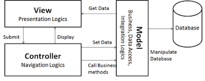The View submits data to the Controller when user clicks on a button or clicks on a menu item from UI. Controller populates submitted data into a Model and calls business method to perform business operation. After performing business operation, Controller forwards control to the next View.